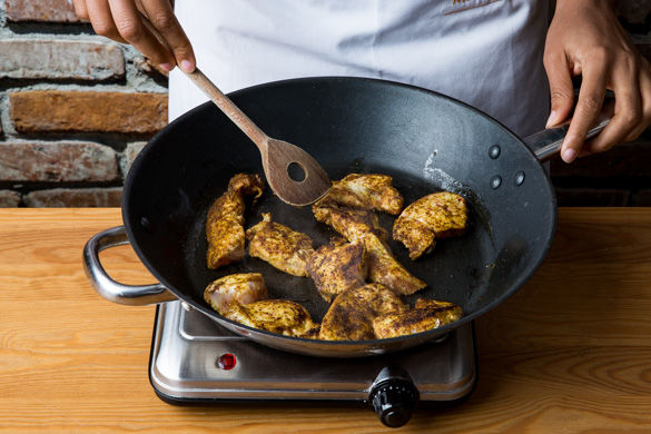 Inzwischen das Hühnchen in einer großen Pfanne von jeder Seite ca. 2Min. scharf anbraten. Das Fleisch aus der Pfanne nehmen und beiseitestellen. Die Pfanne mit den gehackten Tomaten ablöschen, die 1/2 des Brühwürfels darin auflösen, die Zwiebeln und den Knoblauch hinzugeben und alles 5Min. köcheln lassen. Die Sauce mit Salz und Pfeffer abschmecken.