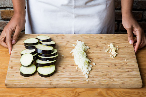 Den Backofen auf 190°C Umluft (210°C Ober-/Unterhitze) vorheizen. Die Zwiebeln und den Knoblauch schälen und fein hacken. Die Strünke der Auberginen abschneiden, dann die Auberginen in ca. 1cm dicke Scheiben schneiden.
