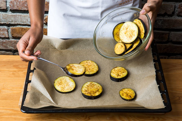 Die Auberginenscheiben mit 2EL Olivenöl, Salz und dem übrigen Gewürzsalz einreiben, auf einem mit Backpapier belegten Backblech verteilen und insgesamt ca. 20–25Min. im Backofen rösten.