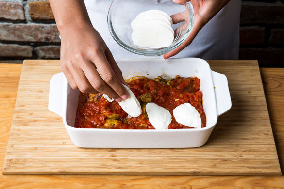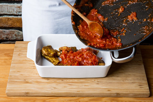 Die Hühnchenmedaillons in einer Auflaufform verteilen und mit der Sauce übergießen. Das Fleisch sollte dabei nicht vollständig von der Sauce überdeckt werden. Neben den Auberginen in 10–15Min. im Ofen fertig garen.