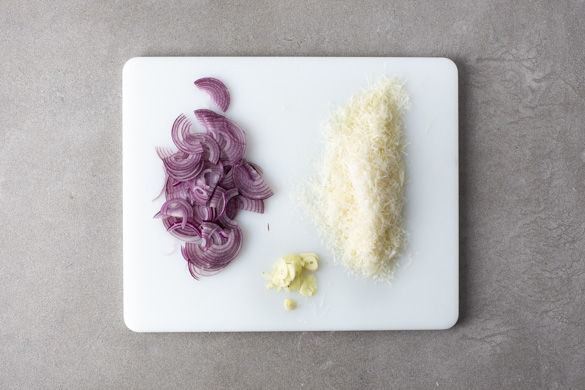 Die Zwiebel schälen, halbieren und in feine Halbringe schneiden. Den Knoblauch schälen und in feine Scheibchen schneiden. Den Käse fein reiben.