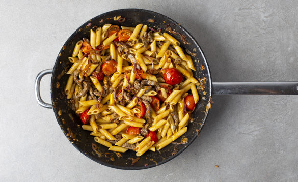 Dieses schnelle Penne-Gericht ist mit zartem Rindergeschnetzelten, fruchtigen Kirschtomaten, würzigem Pesto und frischem Basilikum ganz fein aufgestellt. Frisch geriebener Käse obendrauf, schon ist das Essen fertig.