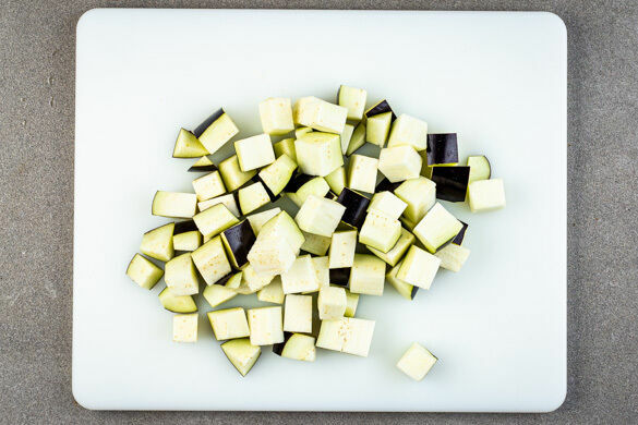 In einem kleinen Topf 300ml leicht gesalzenes Wasser für den Reis zum Kochen bringen. In einem zweiten kleinen Topf ausreichend Wasser für die Eier zum Kochen bringen. Die Aubergine in 1–2cm große Würfel schneiden. Den Reis in einem Sieb kalt abspülen, bis das Wasser klar bleibt.
