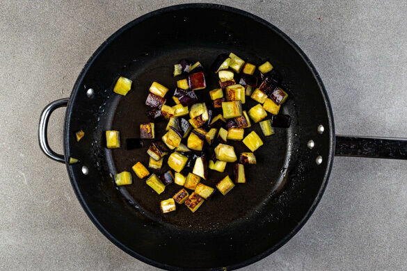 Die Auberginen in einer mittelgroßen Pfanne mit 1EL Pflanzenöl bei mittlerer Hitze ca. 5Min. anbraten, dabei gelegentlich rühren.