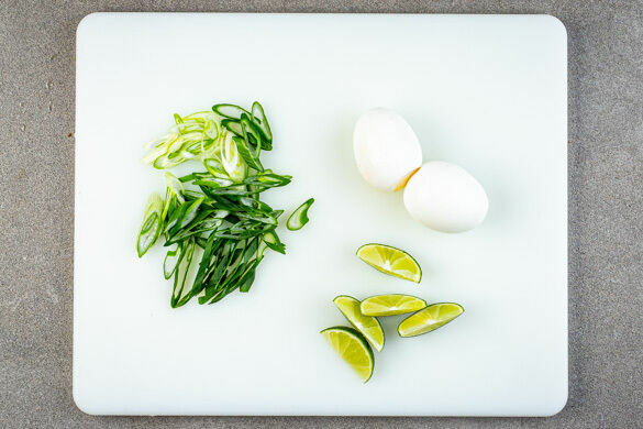 Sobald das Wasser kocht, den Reis hineingeben und abgedeckt bei niedrigster Hitze 12–14Min. kochen, bis das Wasser aufgesogen und der Reis gar ist. Noch ca. 5Min. ohne Hitzezufuhr ziehen lassen. Die Eier vorsichtig in das kochende Wasser geben und in ca. 6Min. weich kochen. Wer härtere Eier mag, kocht sie 2Min. länger. Die Eier in ein Sieb abgießen und kalt abschrecken.
