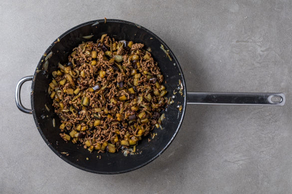 Die Zwiebeln, den Knoblauch und den Ingwer in einer großen Pfanne mit 1–2EL Pflanzenöl bei starker Hitze 1–2Min. anbraten. Die Auberginen und das Rinderhack dazugeben und 4–5Min. mitbraten.