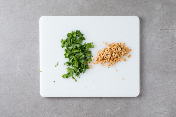 Inzwischen die Korianderblätter von den Stängeln zupfen und grob hacken. Die Erdnüsse ebenfalls grob hacken.