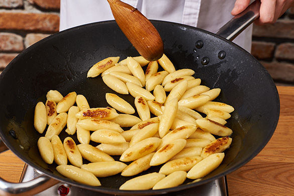 Inzwischen die Schupfnudeln mit ca. 1–2TL Pflanzenöl in einer großen Pfanne bei mittlerer Hitze in 5–6Min. goldgelb anbraten. Die Schupfnudeln dabei vorsichtig mit dem Kochlöffel voneinander trennen, damit sie von allen Seiten gebraten sind.