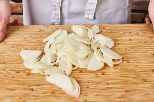 Die Zwiebeln schälen, halbieren und in feine Halbringe schneiden.