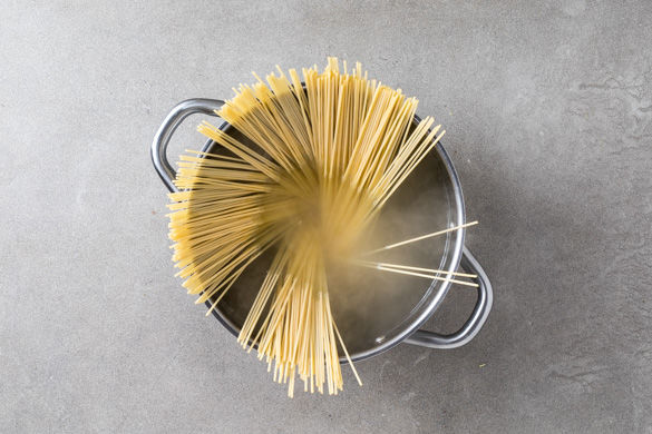 In einem großen Topf ausreichend leicht gesalzenes Wasser für die Pasta zum Kochen bringen. Sobald das Wasser kocht, die Spaghetti in das Wasser geben und leicht köchelnd in ca. 9–10Min. bissfest garen, dann in ein Sieb abgießen und kalt abschrecken.