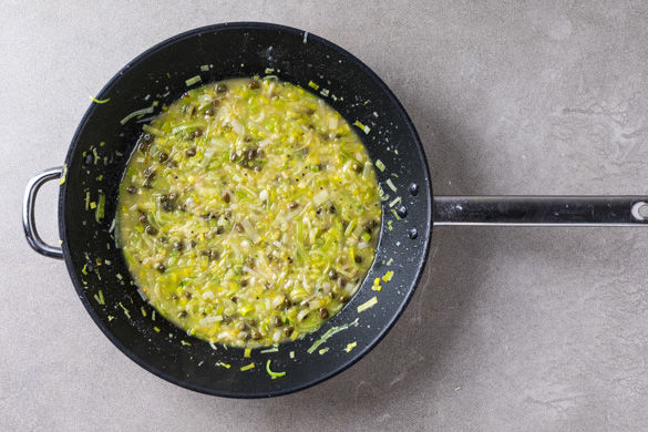 In einer Pfanne 1–2TL Olivenöl bei mittlerer Temperatur erhitzen. Den Lauch hinzugeben und 1–2Min. leicht dünsten. Mit 1EL Mehl bestäuben und alles gut verrühren. Nun den Lauch mit 250ml Wasser ablöschen und 1/2 Brühwürfel hineinbröseln. Die Kapern unterrühren und die Sauce 3–4Min. leicht köcheln lassen.