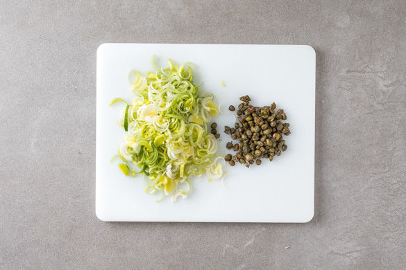 Den Lauch gründlich waschen, die Enden abschneiden, dann den Lauch der Länge nach halbieren und in dünne Streifen schneiden. In einem Sieb die 1/2 der Kapern mit kaltem Wasser abspülen, anschließend grob hacken. Tipp: Wer mag, kann auch alle Kapern verwenden.