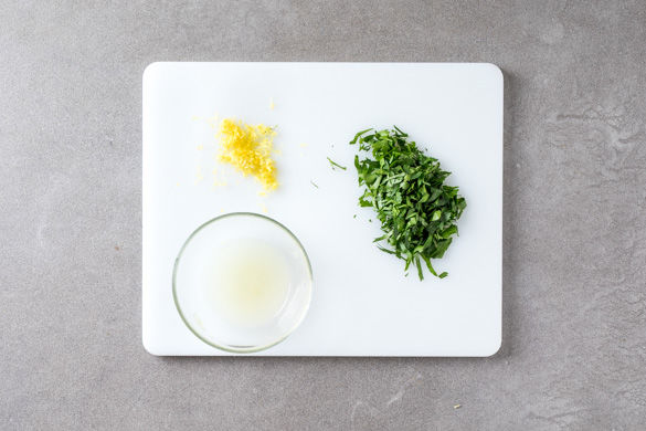 Die Zitronenschale abreiben, dann die Zitrone halbieren und auspressen. Die Petersilienblätter von den Stängeln zupfen und fein hacken.