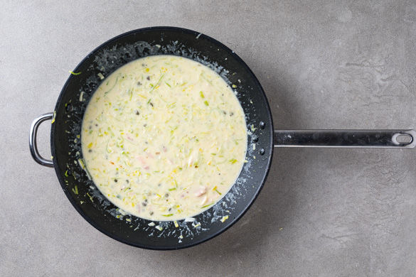 In einer Pfanne 1–2EL Olivenöl bei mittlerer Temperatur erhitzen. Den Lauch hinzugeben und 1–2Min. leicht dünsten. Mit 2EL Mehl bestäuben und alles gut verrühren. Nun den Lauch mit 500ml Wasser ablöschen und den Brühwürfel hineinbröseln. Die Kapern unterrühren und die Sauce 3–4Min. leicht köcheln lassen.