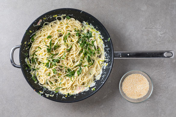 Heute auf dem Programm: Schnelle Küche de luxe! Zu Spaghetti in cremiger Lauchsauce servierst du zarte Räucherforellenfilets mit frischer Petersilie und knusprigem Panko-Topping. Kapern sorgen für extra viel Aroma. Probier es aus!