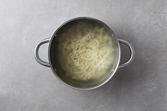 Sobald das Wasser kocht, die 1/2 der Nudeln hinzugeben und 3–5Min. köcheln lassen, bis sie bissfest sind. In ein Sieb abgießen, kalt abschrecken und abtropfen lassen. Tipp: Wer großen Hunger hat, kann auch die gesamte Menge Nudeln zubereiten.