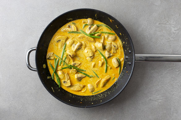 Die in der ostasiatischen Küche beliebten Mie-Nudeln eignen sich für Suppen, Pfannengerichte oder als Beilage für dieses würzige Gericht! Die zarten Hähnchenstreifen werden in gelber Currypaste mariniert, dazu köcheln frische Champignons und knackige Bohnen in der leicht scharfen Sauce – wer es milder mag, nimmt nur die Hälfte der Currypaste.