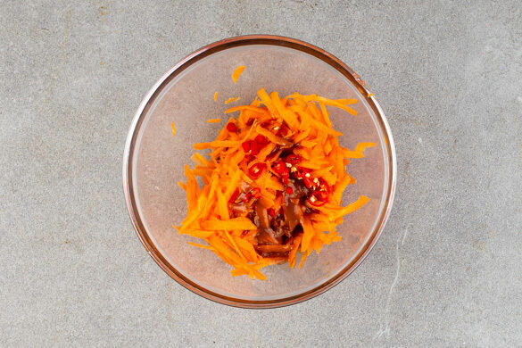 Die Peperoni in feine Ringe schneiden. Tipp: Für weniger Schärfe die Kerne entfernen. Die Tamarindenpaste mit 1TL Wasser, 1TL Zucker, 1 Prise Salz und den Peperoniringen nach Geschmack zu einem Dressing verrühren. Die übrige Karotte grob raspeln, mit dem Dressing vermengen und ziehen lassen.