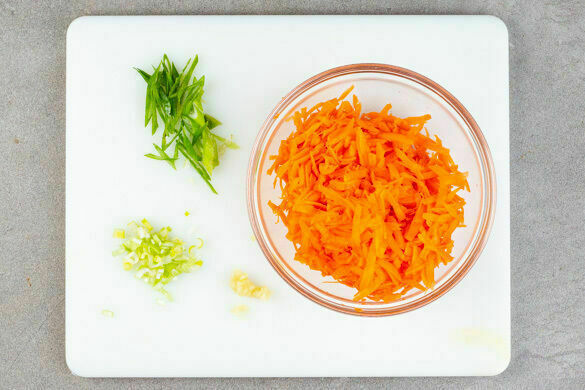 In einem weiteren mittelgroßen Topf ausreichend gesalzenes Wasser für den Spinat zum Kochen bringen. Die Karotten ggf. schälen, grob raspeln, mit 2EL Essig, 1TL Zucker und ½TL Salz vermengen und ziehen lassen. Den weißen Teil der Lauchzwiebeln quer fein schneiden, den grünen Teil schräg in feine Ringe schneiden. Den Knoblauch schälen und sehr fein würfeln oder reiben.