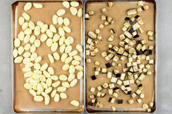 Die Gnocchi auf einem zweiten mit Backpapier ausgelegten Backblech mit 2EL Olivenöl sowie je 1 kräftigen Prise Salz und Pfeffer vermengen. Wenn die Auberginen ca. 10Min. geröstet haben, die Gnocchi über den Auberginen in den Ofen schieben und alles weitere 8–10Min. rösten, bis die Auberginenwürfel weich und die Gnocchi knusprig sind.