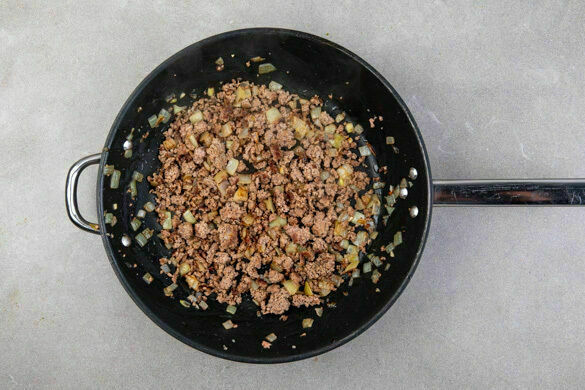 Die Zwiebeln und den restlichen Knoblauch mit 1EL Olivenöl in der Pfanne bei mittlerer Hitze 1–2Min. anschwitzen. Das Hackfleisch mit je 1 kräftigen Prise Salz und Pfeffer dazugeben und 5–7Min. anbraten. Die Gurke längs halbieren, dann quer in dünne Scheiben schneiden und mit 2TL Olivenöl, 1EL Essig sowie je 1 Prise Salz und Pfeffer vermengen.