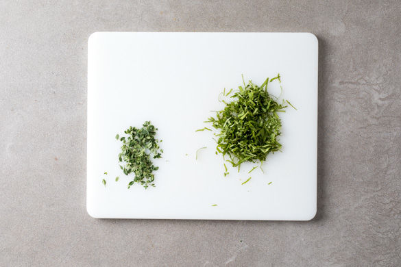 In einem großen Topf ausreichend leicht gesalzenes Wasser für die Pasta zum Kochen bringen. Die Baslilikumblätter von den Stängeln zupfen. Die kleineren Blätter in das größte Basilikumblatt einrollen und die Basilikumblätter mit dem Messer in feine Streifen schneiden. Die Thymianblätter von den Stängeln zupfen.