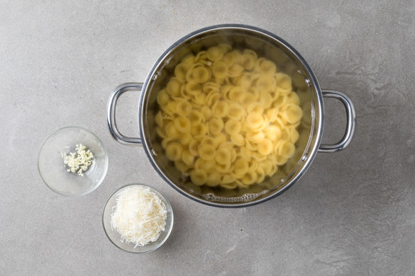 Den Knoblauch schälen und fein hacken. Den Käse reiben. Die Pasta im kochenden Wasser in ca. 7–8Min. bissfest kochen. In ein Sieb abgießen und abtropfen lassen.