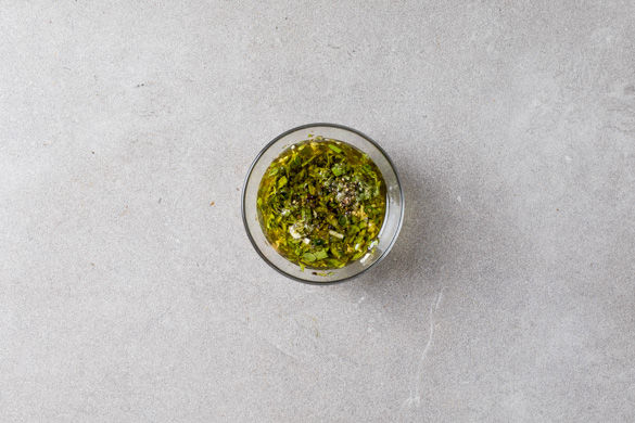 Die Kräuter und den Knoblauch mit dem Balsamicoessig und 3–4EL Olivenöl verrühren und das Kräuteröl mit Salz und Pfeffer abschmecken.