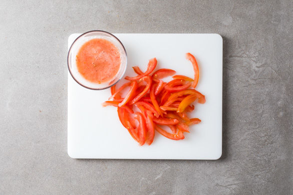 Die Tomaten vierteln, dabei den Strunk entfernen. Das Kerngehäuse mit einem Stabmixer in einem höheren Gefäß fein pürieren und mit Salz, Pfeffer und 1 Prise Zucker würzen. Das Tomatenfruchtfleisch in dünne Streifen schneiden.
