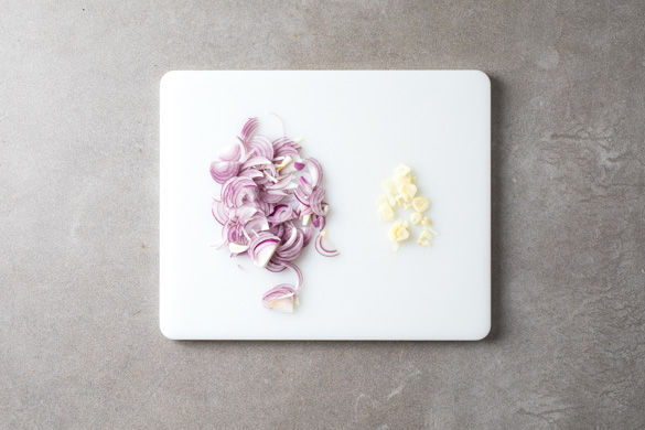 Den Backofen auf 230°C Umluft (250°C Ober-/Unterhitze) vorheizen. Die Zwiebel schälen, halbieren und in feine Halbringe schneiden. Den Knoblauch schälen und fein hacken.