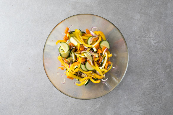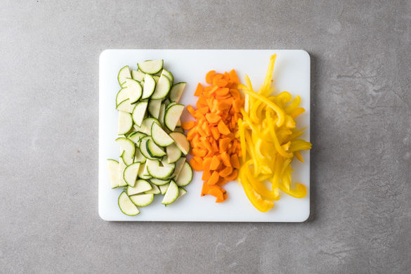 Die Enden der Zucchini abschneiden, dann die Zucchini längs halbieren und quer in ca. 0,5cm dünne Scheiben schneiden. Die Karotten schälen, die Enden abschneiden, dann die Karotten längs halbieren und quer in 0,3cm dünne Scheiben schneiden. Die Paprika vierteln, entkernen und in dünne Streifen schneiden.