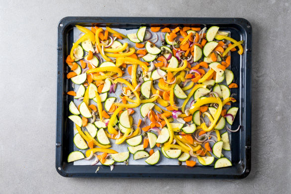 Das Gemüse auf einem mit Backpapier ausgelegten Backblech verteilen und ca. 15–20Min. im Ofen rösten, bis es an den Rändern zu bräunen beginnt.