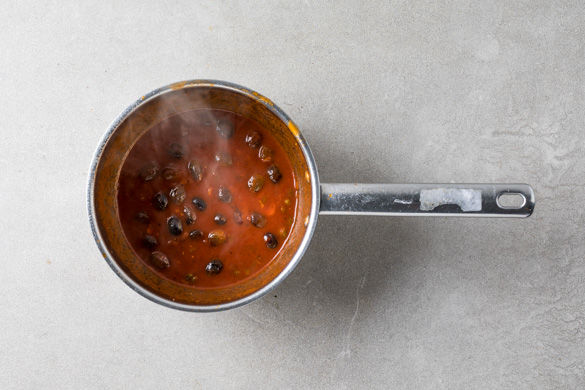 In einem kleinen Topf ca. 150ml Wasser zum Kochen bringen. Die 1/2 des Tomatenmarks, den Knoblauch, die restlichen Kapern samt Flüssigkeit, die Oliven sowie 1 Prise Zucker hinzugeben und alles bei mittlerer Hitze aufkochen lassen. Die Tomatensauce mit Salz und Pfeffer abschmecken. Vorsicht mit dem Salz, die Kapern und die Oliven sind schon sehr salzig!