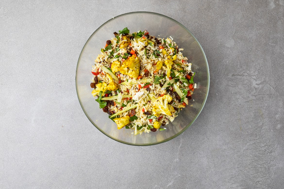 Der raffinierte Mix aus fluffigem Basmatireis, geröstetem Blumenkohl, knackigem Gemüse und frischen Kräutern liegt garantiert nicht schwer im Magen. Das leichte Joghurtdressing mit gerösteten Kokosraspeln, köstlich-süßen Rosinen und erfrischender Limette zaubert extra viel Aroma herbei, Sonnenblumenkerne sorgen für feinen Biss.