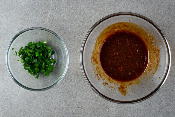 Den Ingwer schälen, fein reiben und mit der Sojasauce, der Hoisinsauce, der ½ der Sweet-Chili-Sauce sowie 1EL Wasser verrühren. Den grünen Teil der Lauchzwiebel in grobe Ringe schneiden.