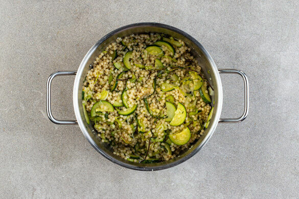 Den Lauch in dünne Ringe schneiden. Die Zucchini längs halbieren, dann in dünne Scheiben schneiden. Den Knoblauch schälen und grob würfeln. Den Lauch, die Zucchini und den Knoblauch in einem mittelgroßen Topf mit 1EL Pflanzenöl und 1 Prise Salz bei mittlerer Hitze ca. 2Min. anbraten, dabei regelmäßig umrühren.