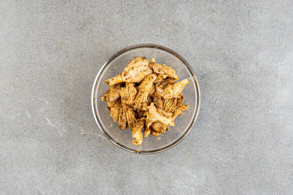 Eine mittelgroße Pfanne 0,5cm hoch mit Pflanzenöl füllen und mittelhoch erhitzen. Tipp: Das Öl ist heiß genug, sobald sich kleine Bläschen bilden, wenn man einen Holzspieß hineinhält. Die ½ der Pilze ins heiße Öl geben. In 3–4Min. goldbraun und knusprig frittieren, dabei mehrmals wenden. Die Pilze auf Küchenkrepp abtropfen lassen. Den Vorgang mit den übrigen Pilzen wiederholen.