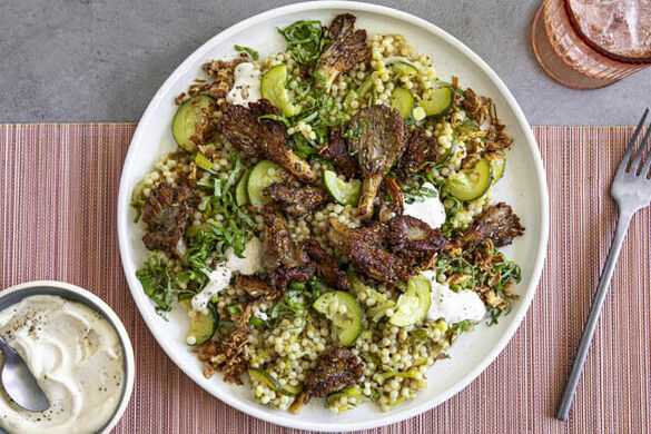Frittierte Austernpilze sind eine echte kulinarische Offenbarung und jeden Fettspritzer wert. Das leicht fleischige, faserige Innere ergibt gemeinsam mit der knusprigen äußeren Schicht ein köstliches Zusammenspiel der Texturen. Wir würden sie auch solo verspeisen, haben uns aber trotzdem für eine Beilage entschieden: zarten Gemüse-Perlencouscous aromatisiert mit Thymian, dazu Basilikum und ein cremiger Dip.