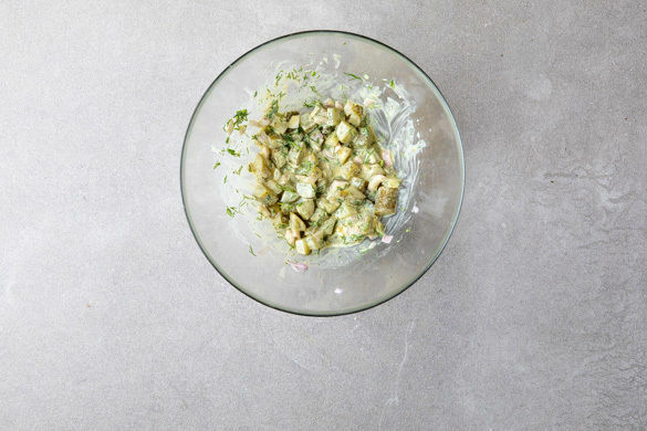 Die Schalotte schälen, halbieren und in feine Würfel schneiden. Den Dill samt Stängeln grob schneiden. Den Apfel in 1–2cm große Stücke schneiden. 2EL Essig mit 1TL Zucker verrühren, bis sich der Zucker auflöst. Die Gurke längs halbieren und mit einem Löffel die Kerne herauskratzen, dann in kleine Würfel schneiden und mit dem Essig vermengen.
