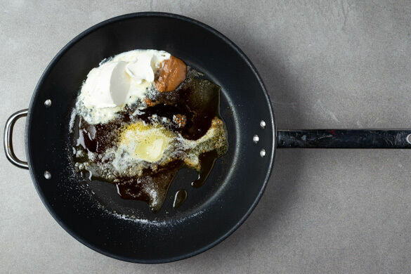Sobald der Zucker geschmolzen ist und eine goldene Farbe angenommen hat, 2TL Butter unterrühren. Die Hitze auf die niedrigste Stufe reduzieren und nach und nach die Crème fraîche und ca. 1TL Misopaste unterrühren, bis eine glatte, glänzende Sauce entsteht. Je nach Herd die Sauce auf dem Herd oder an einem warmen Ort warm halten.