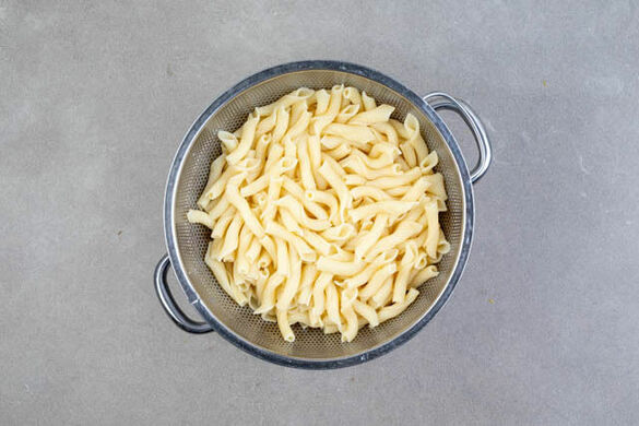 Die Pasta in das kochende Wasser geben und in 7–9Min. bissfest kochen. In ein Sieb abgießen und abtropfen lassen.