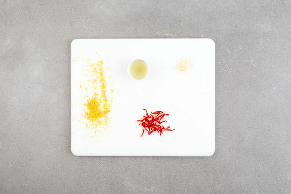 In einem mittelgroßen Topf ausreichend gesalzenes Wasser für die Pasta zum Kochen bringen. Die Zitronenschale abreiben, dann die Zitrone halbieren und auspressen. Den Knoblauch schälen und fein würfeln. Die Peperoni längs halbieren und in hauchdünne Streifen schneiden. Tipp: Für weniger Schärfe die Kerne entfernen.