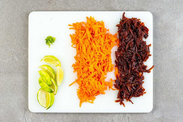 Die Karotte ggf. schälen und mit einer Küchenreibe grob raspeln. Die Rote Bete ebenfalls grob raspeln. Die Limettenschale abreiben und die Limette in 4 Spalten schneiden. Tipp: Da Rote Bete stark färbt, beim Verarbeiten am besten Küchenhandschuhe und Schürze tragen.