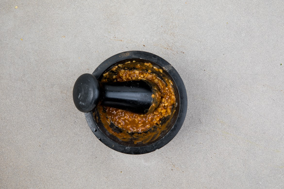 In einem mittelgroßen Topf 600ml leicht gesalzenes Wasser für den Reis zum Kochen bringen. Den Ingwer und den Knoblauch schälen und fein würfeln. Mit der Tamarindenpaste in einem Mörser zu einer gleichmäßigen Paste verarbeiten. Tipp: Wer keinen Mörser hat, kann den Ingwer und den Knoblauch fein reiben und mit der Tamarindenpaste verrühren.