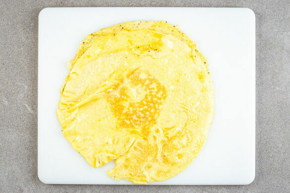 Die Eier aufbrechen und mit 1/2TL Salz verquirlen. In derselben Pfanne 1EL Pflanzenöl bei mittlerer Hitze erwärmen. Die Eiermischung hineingießen, dabei die Pfanne leicht schwenken, um ein gleichmäßiges Omelett zu erhalten. Das Omelett ohne Rühren 2–3Min. anbraten, dann wenden und in ca. 1Min. goldbraun und gar braten. Das Omelett aus der Pfanne nehmen.