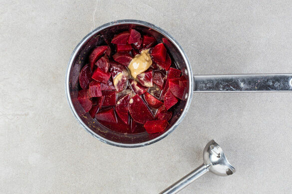 Die Rote Bete in 2–3cm große Stücke schneiden, dabei am besten Küchenhandschuhe tragen. Mit 50ml Brühe und der Tahinipaste in einem kleinen Topf abgedeckt bei mittlerer Hitze ca. 5Min. erhitzen, dann mit einem Stabmixer zu einem cremigen Hummus pürieren. Ggf. löffelweise Wasser bis zur gewünschten Konsistenz zufügen. Mit 1EL Butter sowie Salz und Pfeffer nach Geschmack würzen.