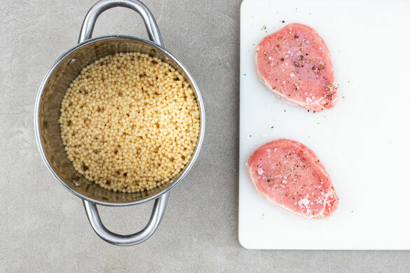 Der Perlencouscous sieht mit seinen kleinen runden Kügelchen nicht nur hübsch aus, sondern hat auch einen feinen, nudelartigen Biss. Wir präsentieren ihn heute verfeinert mit Petersilie und Rosinen zu einem saftigen Schweinesteak und leckerem Rote-Bete-Hummus. Geröstete Mandelblättchen dazu – ein Traum!