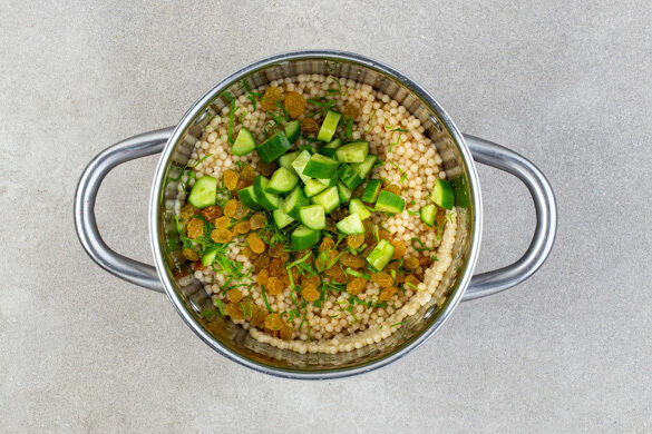Die Gurke der Länge nach vierteln und in kleine Stücke schneiden, dann mit den Rosinen und der Petersilie unter den Perlencouscous mengen. Mit Salz und Pfeffer abschmecken. Das Fleisch mit dem Rote-Bete-Hummus und dem Perlencouscous anrichten, mit der Sauce beträufeln und mit den Mandeln garniert servieren.