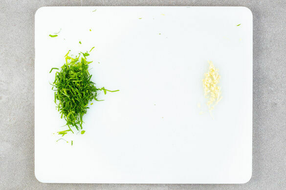 Die Petersilie samt Stängeln fein schneiden. Den Knoblauch schälen und fein würfeln.