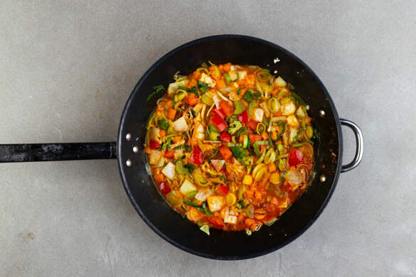 Den Gemüsemix in einer großen Pfanne mit 2EL Butter bei mittlerer bis starker Hitze 6–8Min. anbraten, bis der Lauch glasig wird. Die Tomaten, die Rosinen, die Harissa und das restliche Brühgewürz in die Pfanne rühren. 400ml Wasser angießen, aufkochen und die Sauce bei mittlerer Hitze 6–8Min. einköcheln lassen.